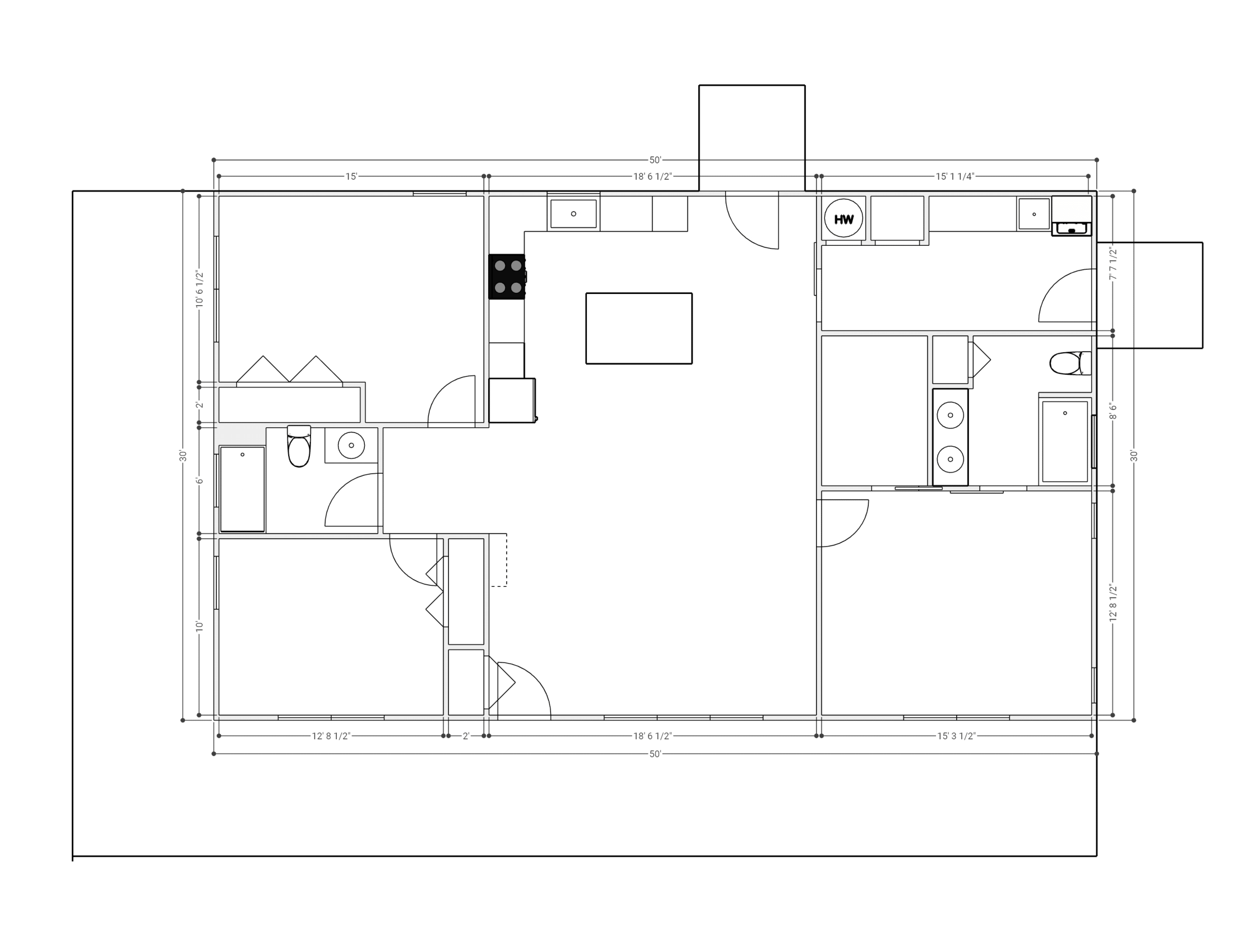 3 bedroom, 2 bath layout with generous central living area and kitchen.